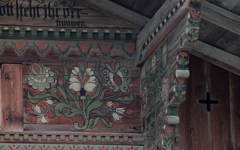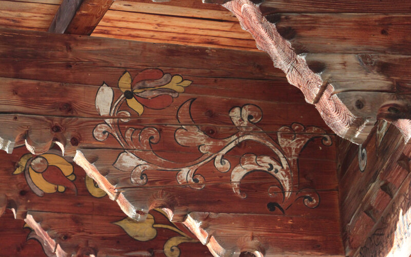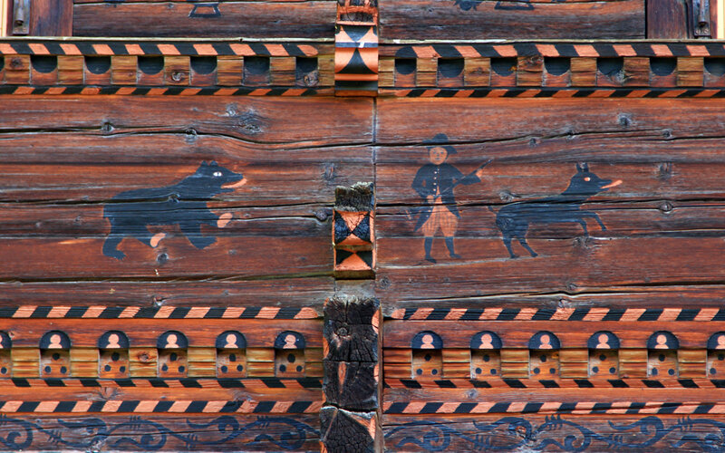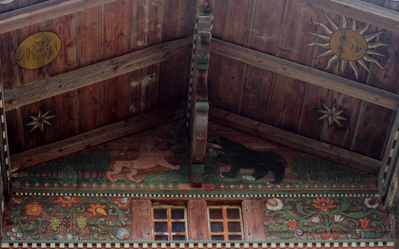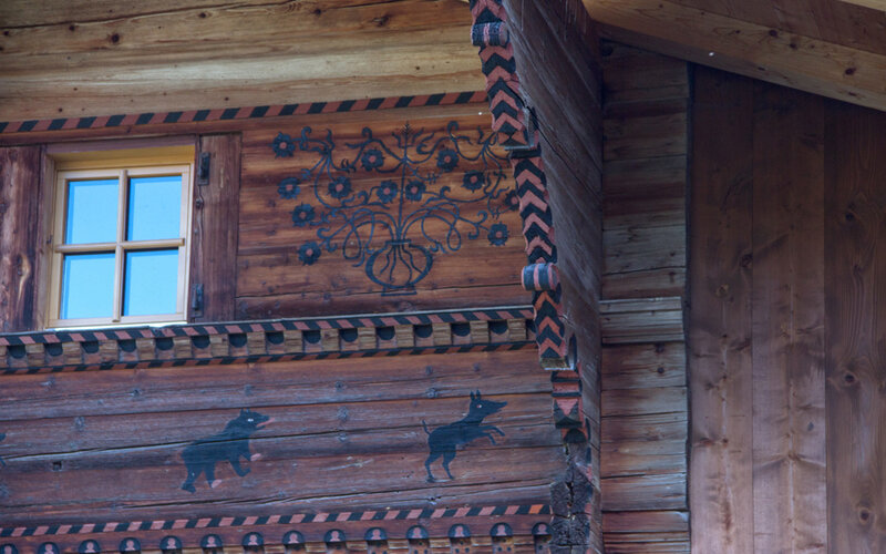 Nr. 1041, datiert 1778, restauriert 1971. Werkmeister Christen Christeler für Bartlome Greiben und Margreta Grünewald. Reiner Blockbau. Reich…
