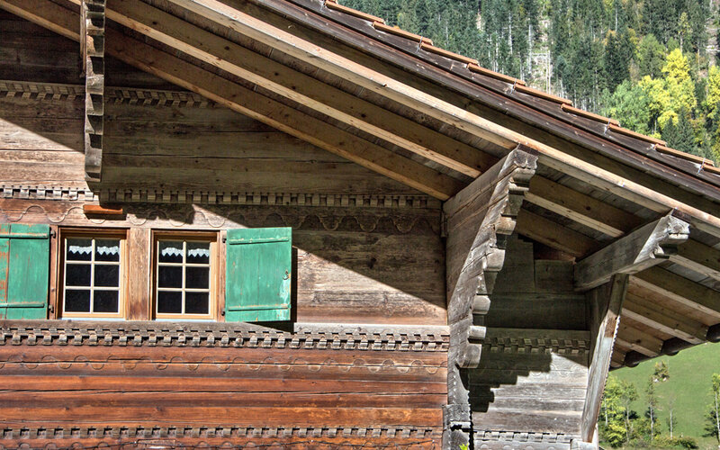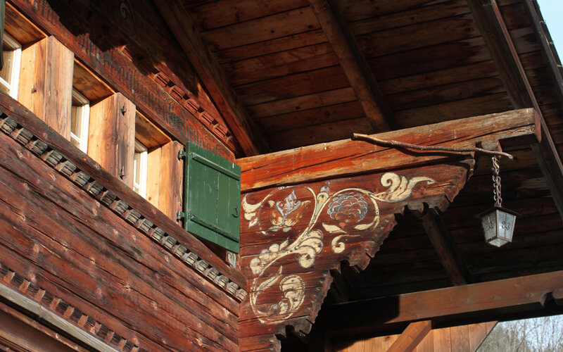 Nr. 531. Um 1800 wahrscheinlich von Zimmermeister Johannes Schläppi, Ständer-/Blockbau, reicher Zimmermannsdekor mit flachgeschnitzten Blumenmotiven…
