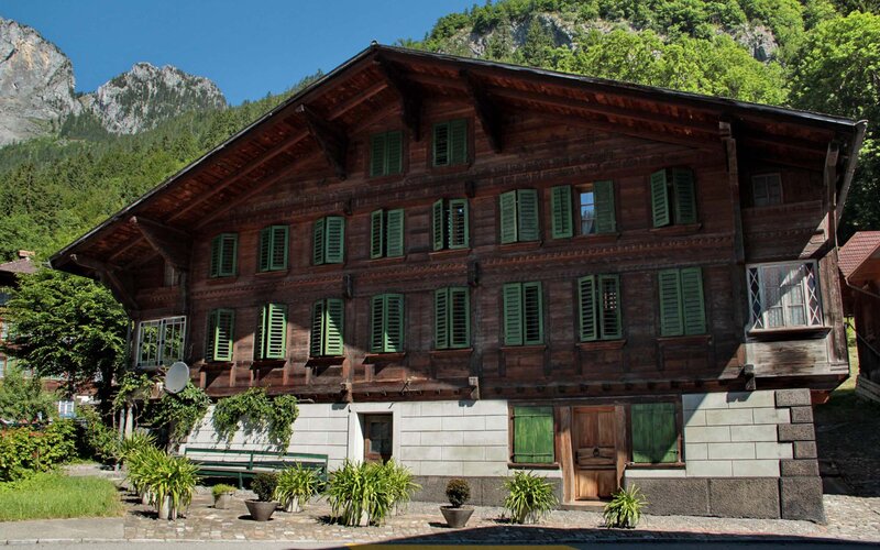 Dieses Bauernhaus (Nr. 46), erbaut 1745 von Zimmermeister Christian Wolet für Hans Matti und Susanna Lehnherrin, ist eines der schönsten bemalten…